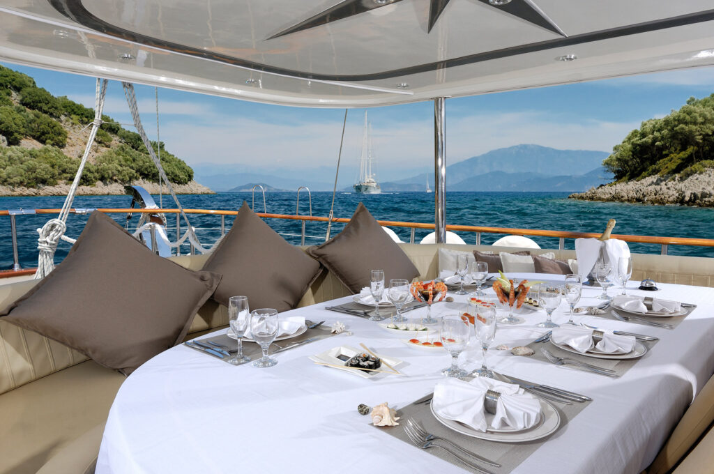 Aboard Alessandro I, dining becomes an experience in itself. The talented chef crafts bespoke culinary creations, served in the elegant salon with four beautifully set tables and panoramic sea views. For those who prefer the outdoors, the Aft deck offers an inviting al fresco setting, perfect for sunset dinners, where every dish is enhanced by the beauty of the horizon.