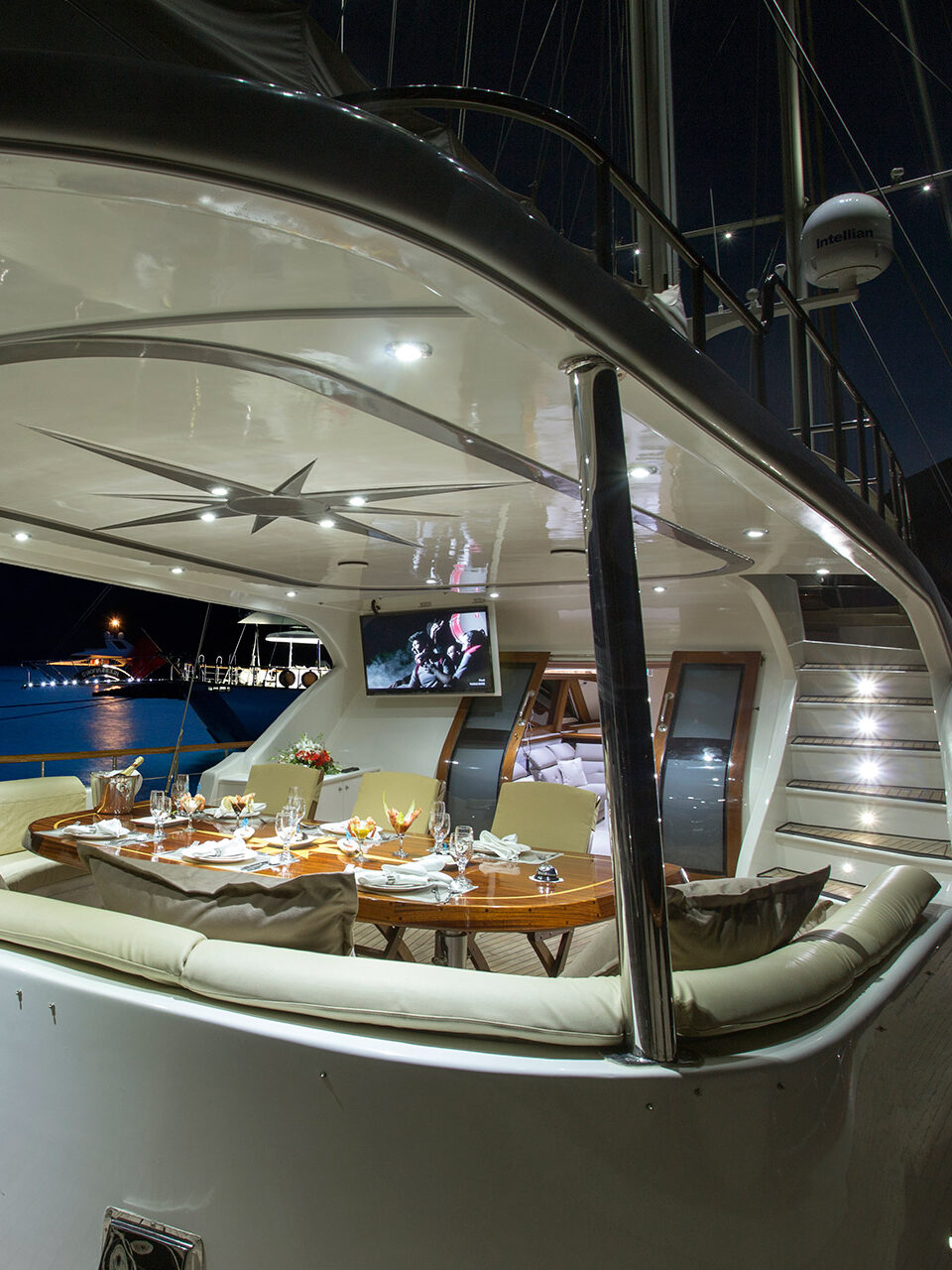The flybridge is designed as the ultimate vantage point at sea, combining comfort, luxury, and panoramic views. Here, guests can lounge in spacious cushioned lounge area, enjoy cocktails in a relaxed yet elegant setting. The flybridge becomes the social heart of the yacht, ideal for sunset gatherings, stargazing nights, or simply soaking in the beauty of the surroundings.