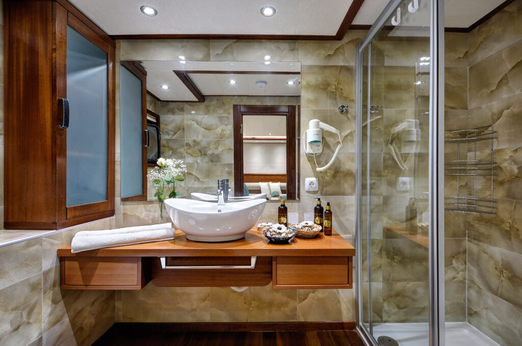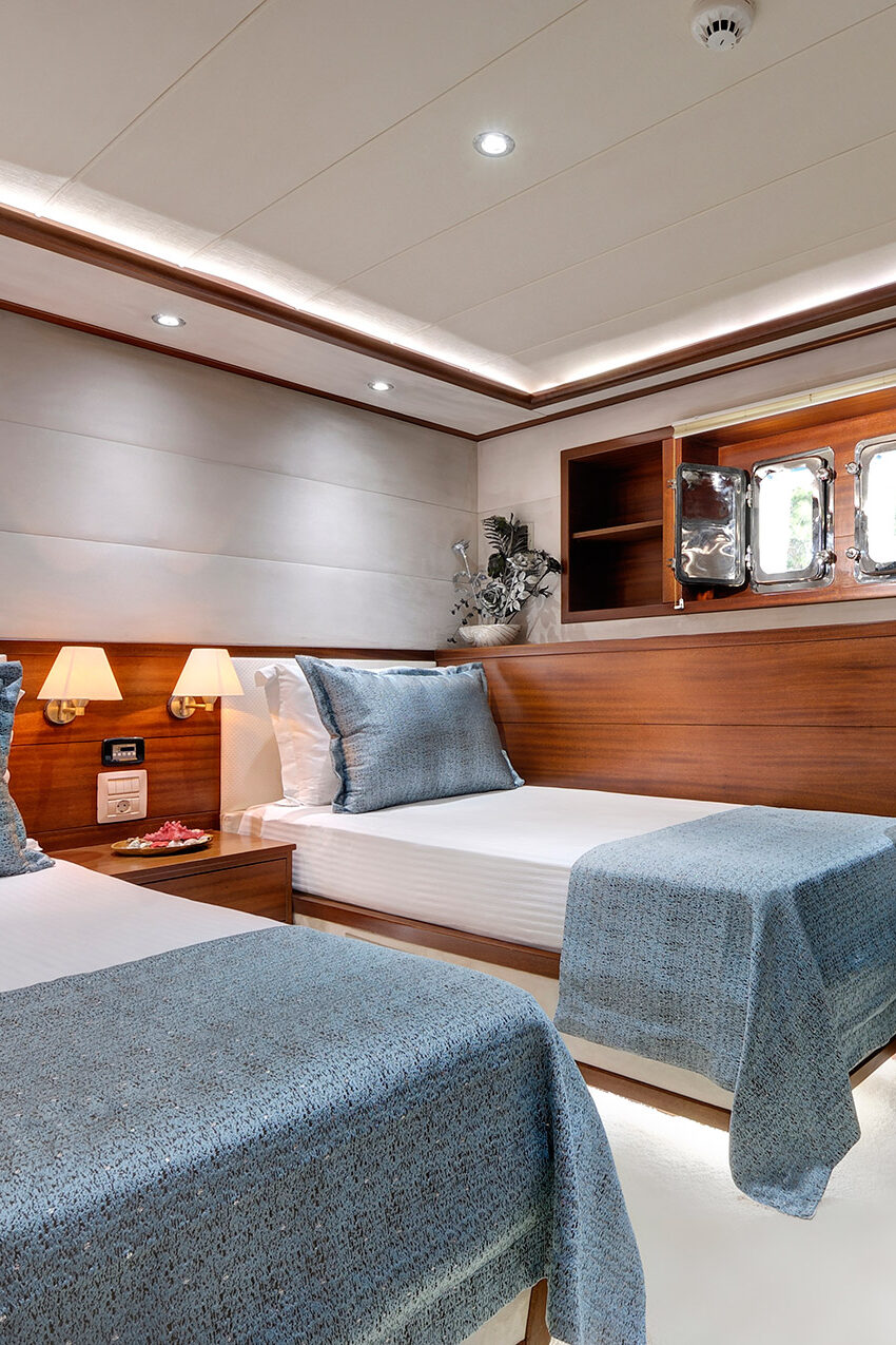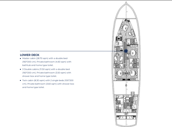 Yacht Alessandro I welcomes up to 10 guests in 5 well-appointed cabins, each with ensuite bathrooms and modern amenities. The expansive Master suite (28.7 sqm) provides exceptional space and comfort, while a flexible Twin cabin (8.3 sqm) is ideally suited for children. Three Double cabins (11.5 sqm each) complete the layout, offering every guest a private and relaxing retreat.