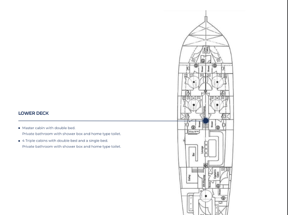 Shipboard accommodation: maximum number of 14 (10+4) guests sleeping in 5 cabins.