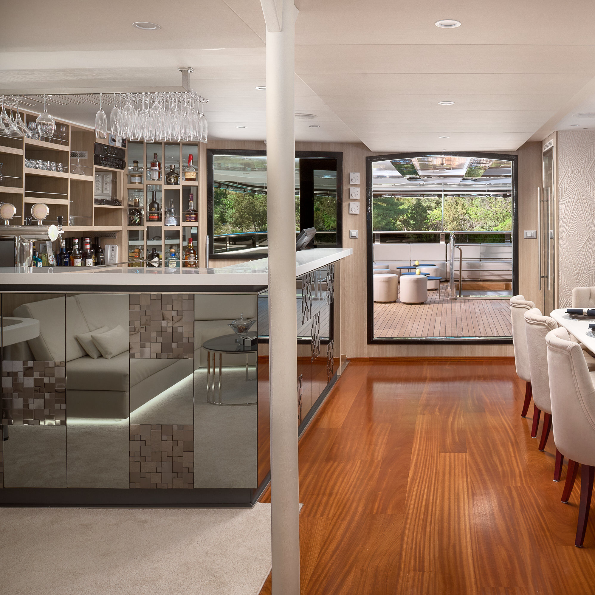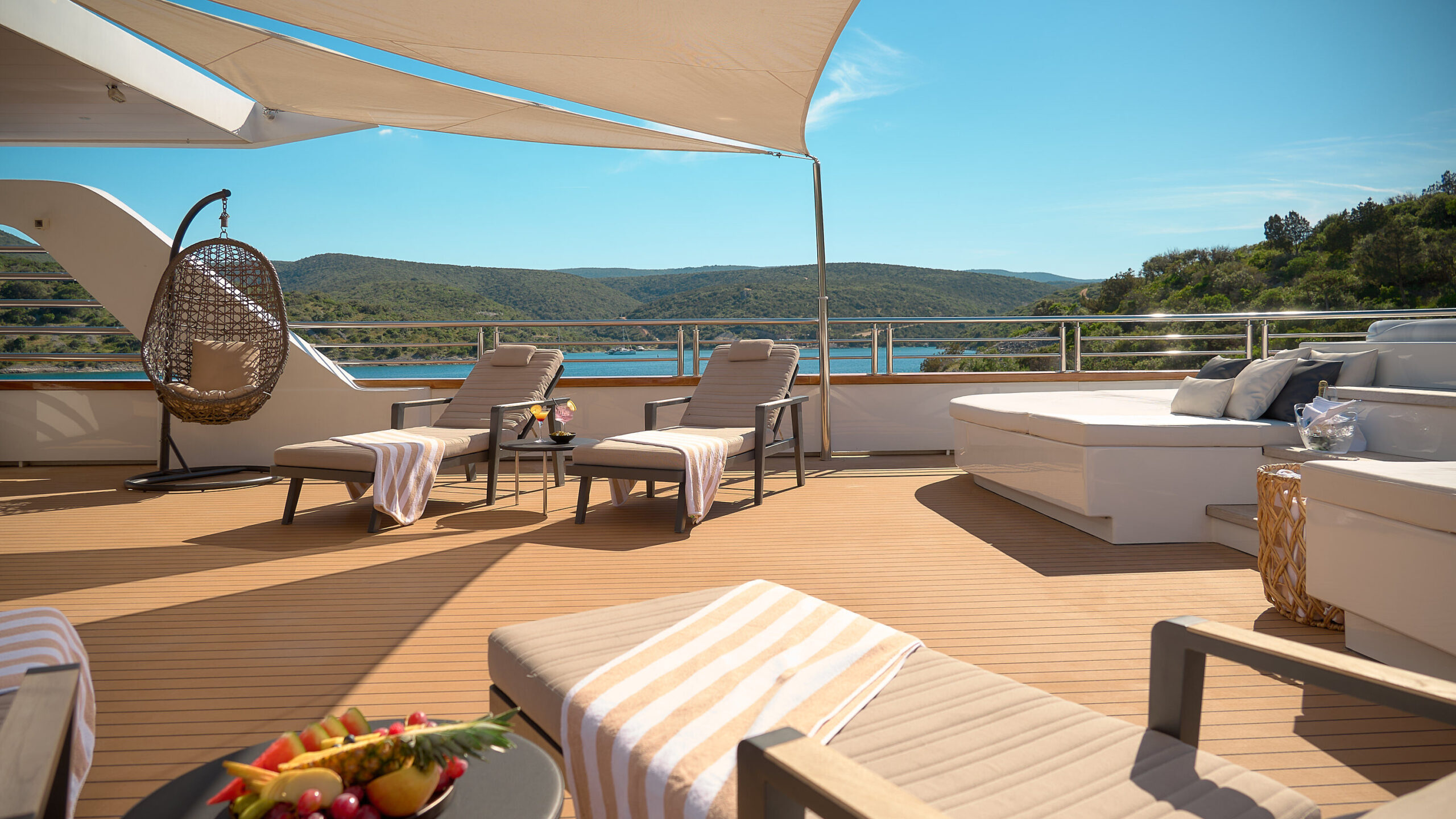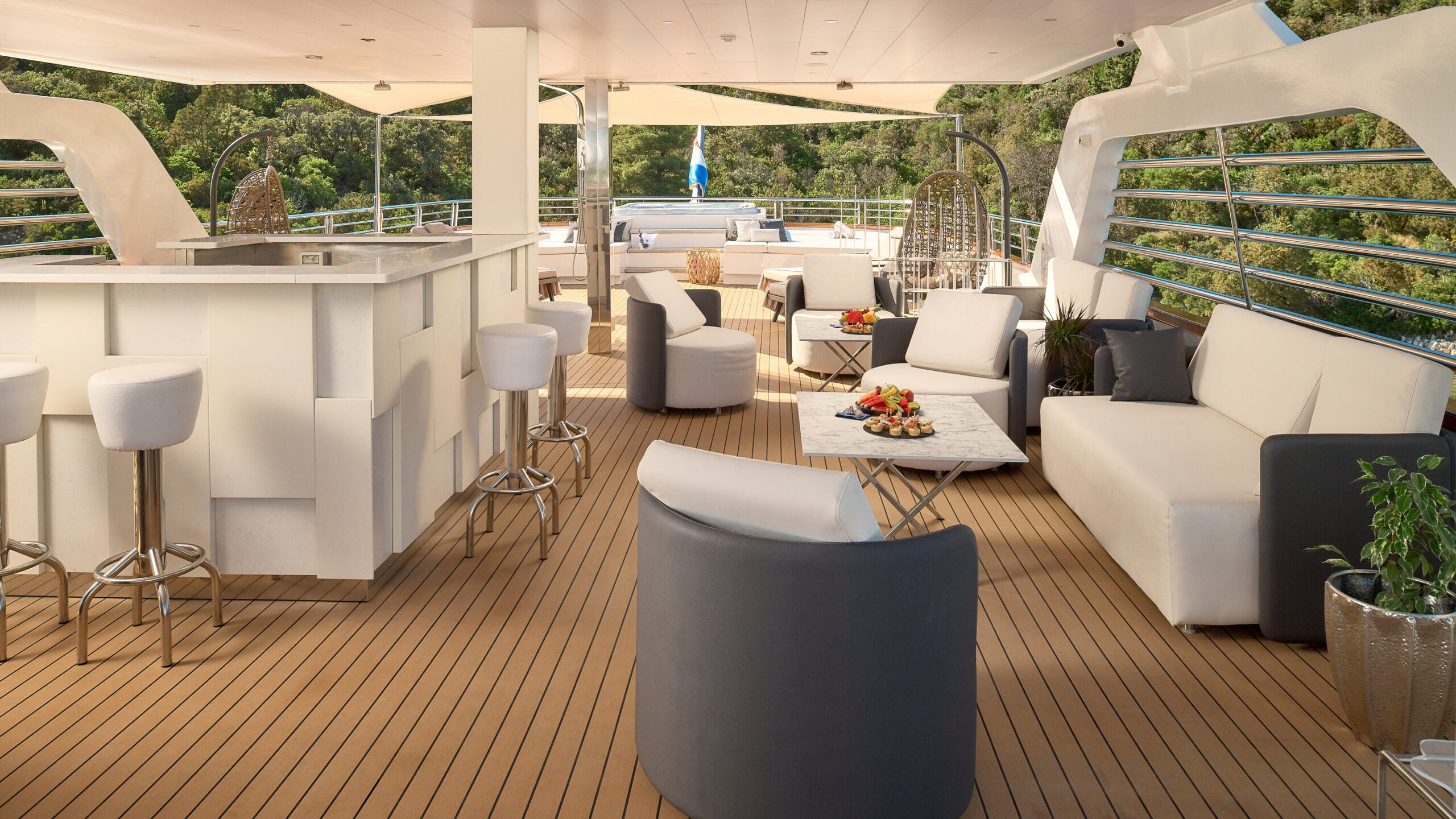 Sundeck is the main retreat for all gatherings under the sun and stars. Equipped with ample sunbathing chairs, a jacuzzi, a rainforest shower and a fully stocked white marble bar for pure comfort and relaxation. Make sure to connect to the Bluetooth speakers for personalized listening pleasure.