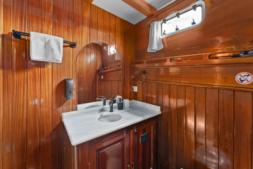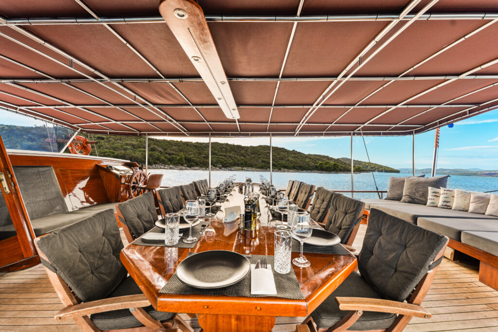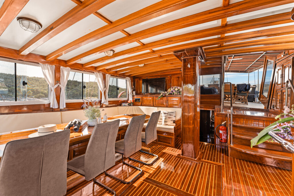 The salon offers plenty of space for indoor fun and relaxation in bad weather. Adorned in traditional deep gloss varnished timber, the cabins on this traditional wooden vessel exude warmth, offering guests a cozy and timeless retreat.