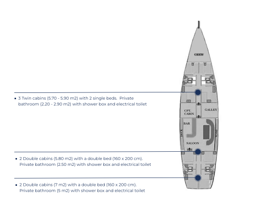 Al fresco dining area on the aft deck, a delightful snack and cocktail space on deck amidships and an intimate foredeck nook for a nightcap under the stars.