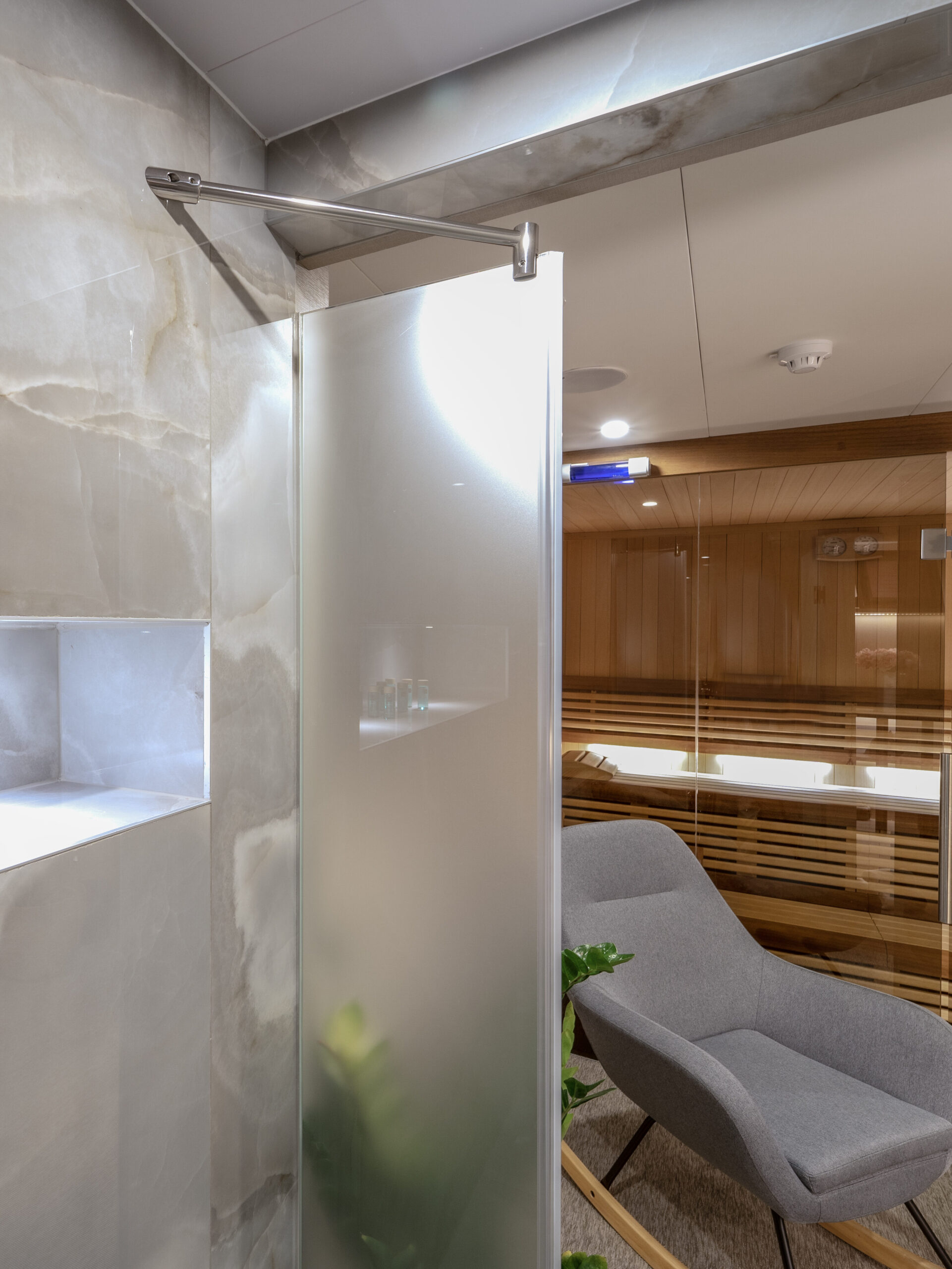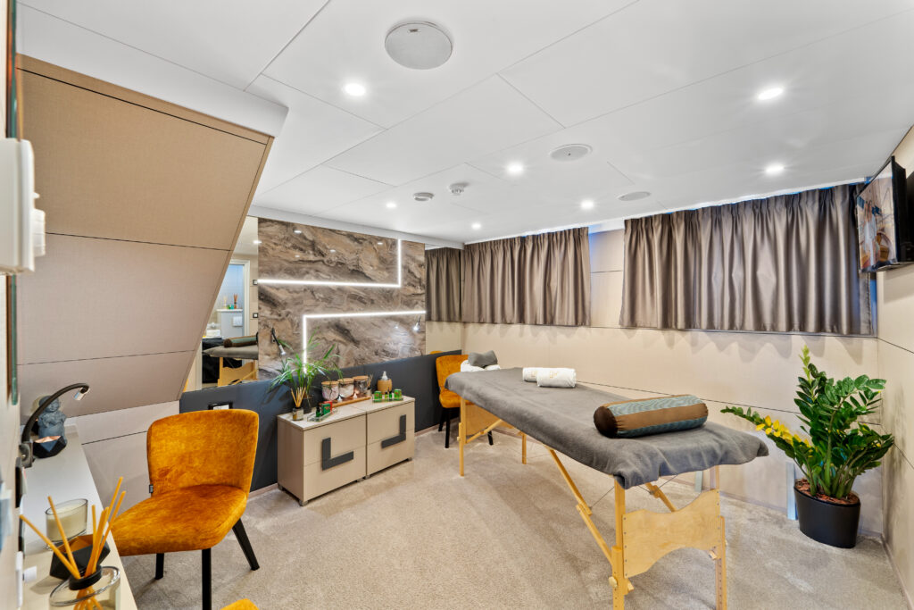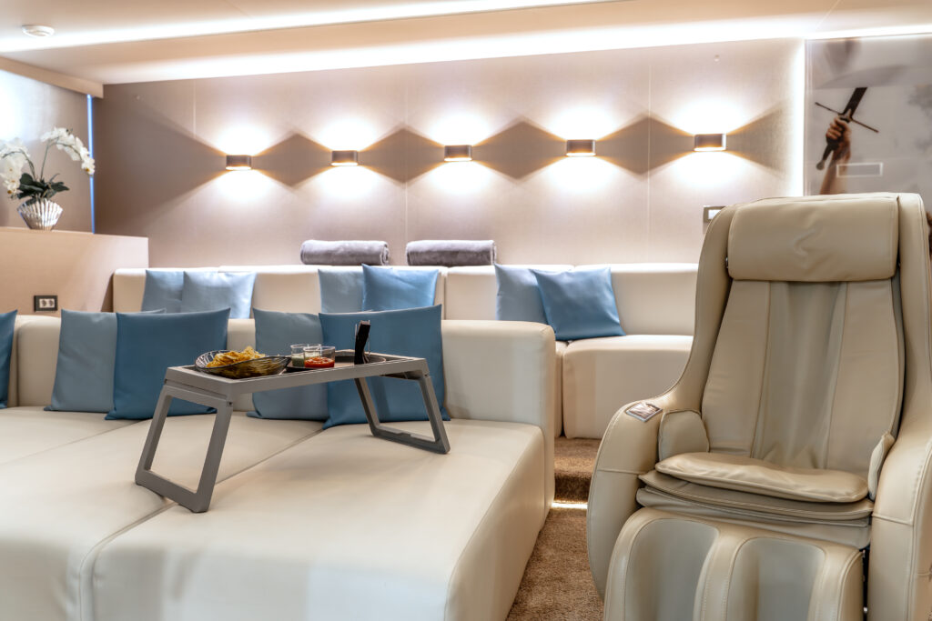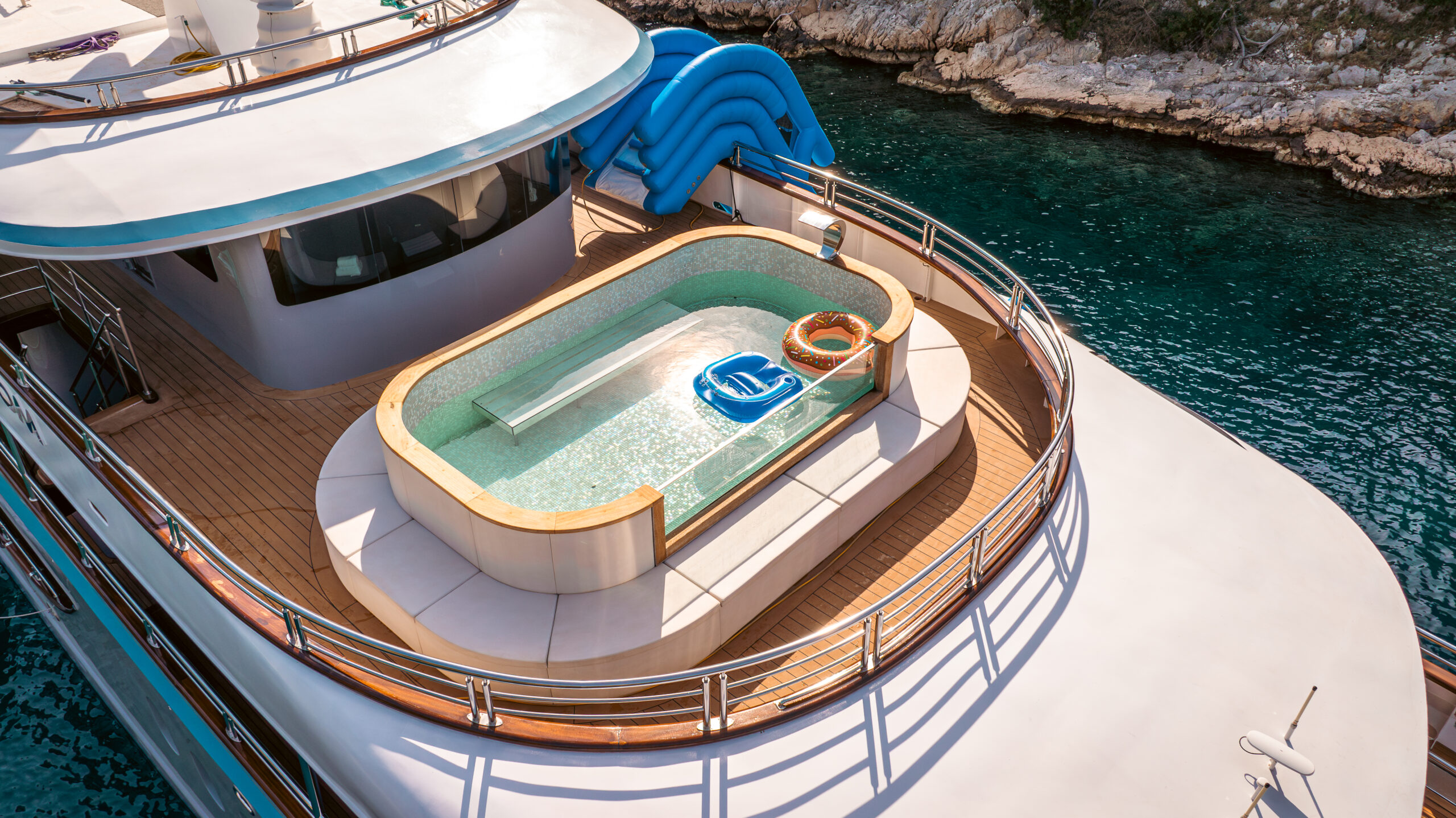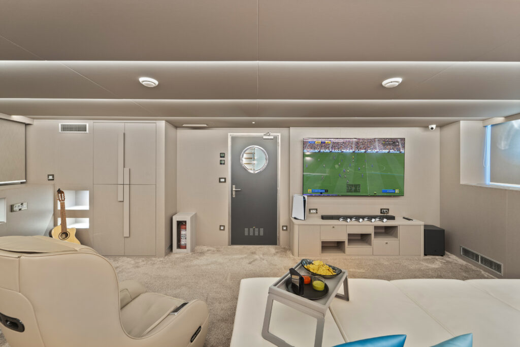 as well as a cinema, gym, sauna, beauty spa/massage room, and a full menu of water toys..