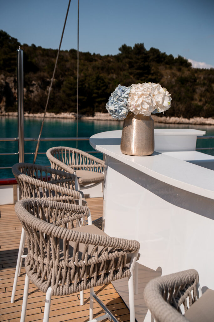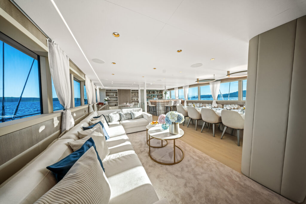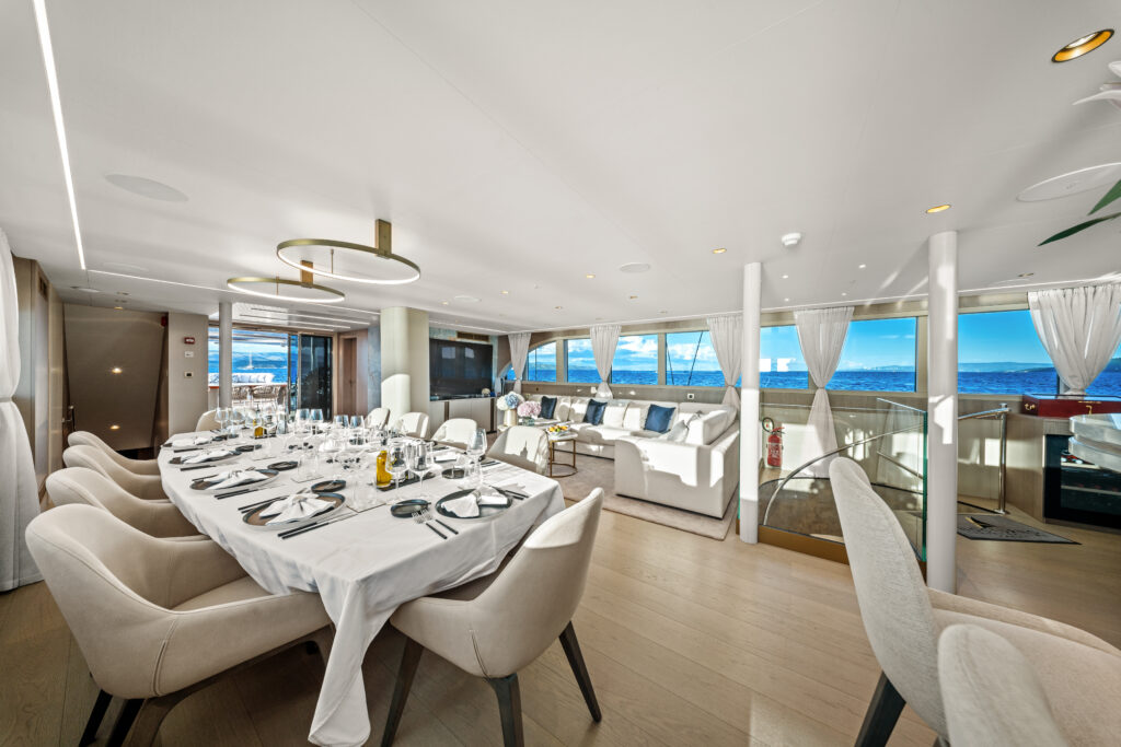Designed to inspire relaxation and vibrant socializing, the main deck aft boasts a stylish dining area, perfect for shaded al fresco dining. Up on the sundeck, you’ll find another dining area offering a 360° view, a bar, a dedicated area for recreation, and a stunning lounging space with a jacuzzi—ideal for unwinding in style or hosting unforgettable moments with friends and family.