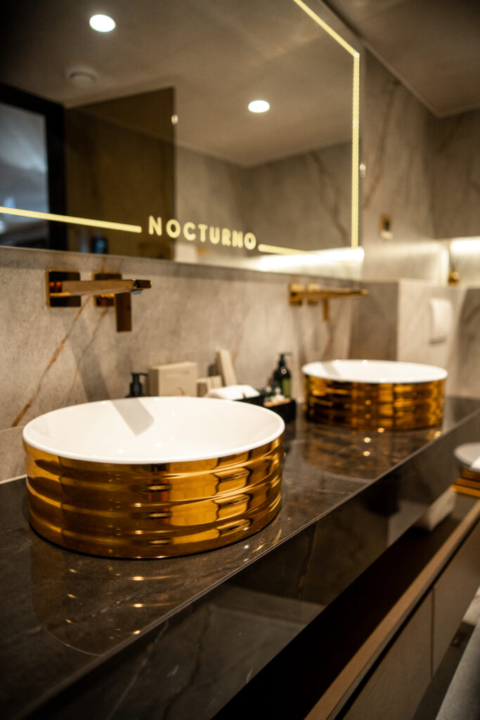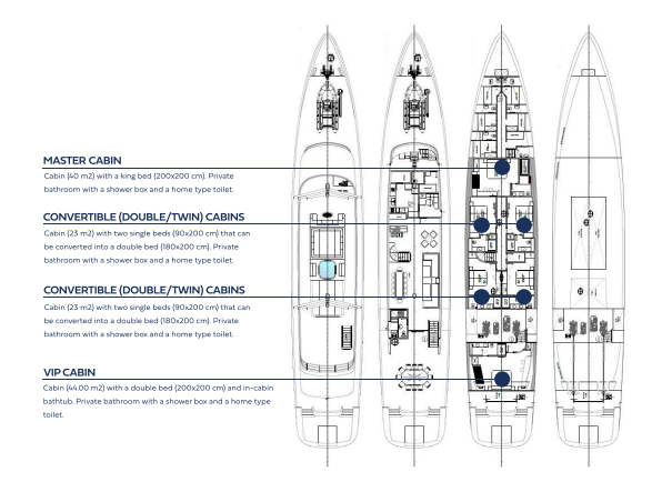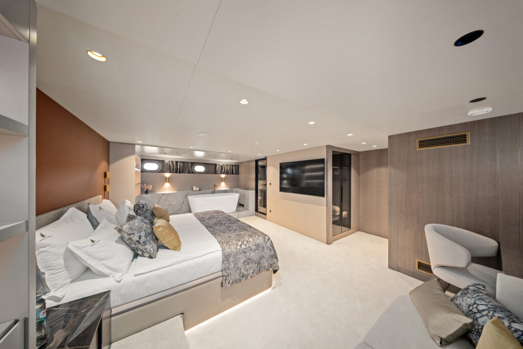 Nocturno’s six beautifully appointed cabins blend refined design with first-class comfort. The master and VIP suites invite you to unwind in king-size beds surrounded by soft tones and thoughtful details, while the en-suite bathrooms add an extra layer of indulgence. Flexible layouts in the remaining cabins make Nocturno an ideal choice for both families and groups seeking space, privacy, and effortless style at sea.