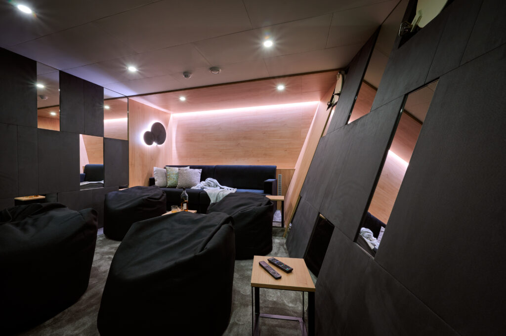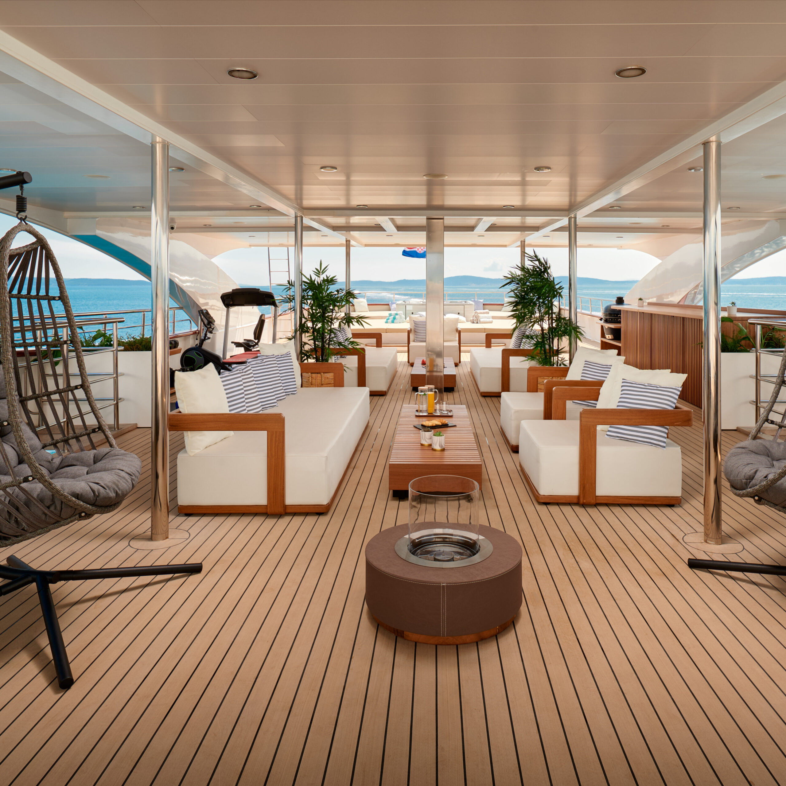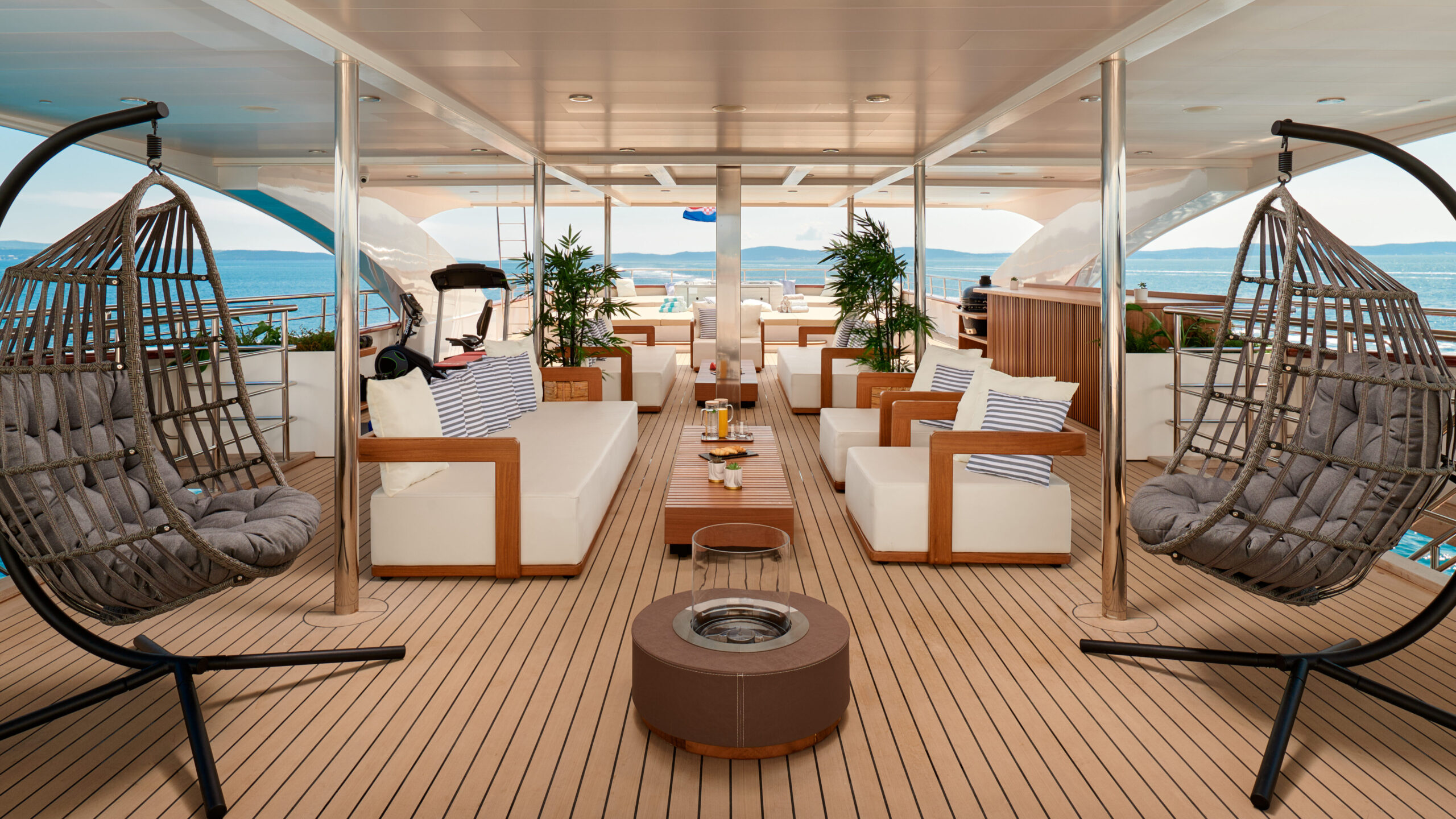 The Sundeck offers an enormous area of 160 m2 that spans the entire yacht. The deck includes anopen bar and barbecue for guests to enjoy, as well as comfortable hanging egg chairs, an inviting open fireplace, a designated area with sun mattresses, and plenty of cozy seating options. Furthermore, to accommodate guests seeking shade while indulging in the Jacuzzi, a sail covering is thoughtfully provided. For those eager to exercise with the best view, there is also a dedicated space for workouts and fitness activities.