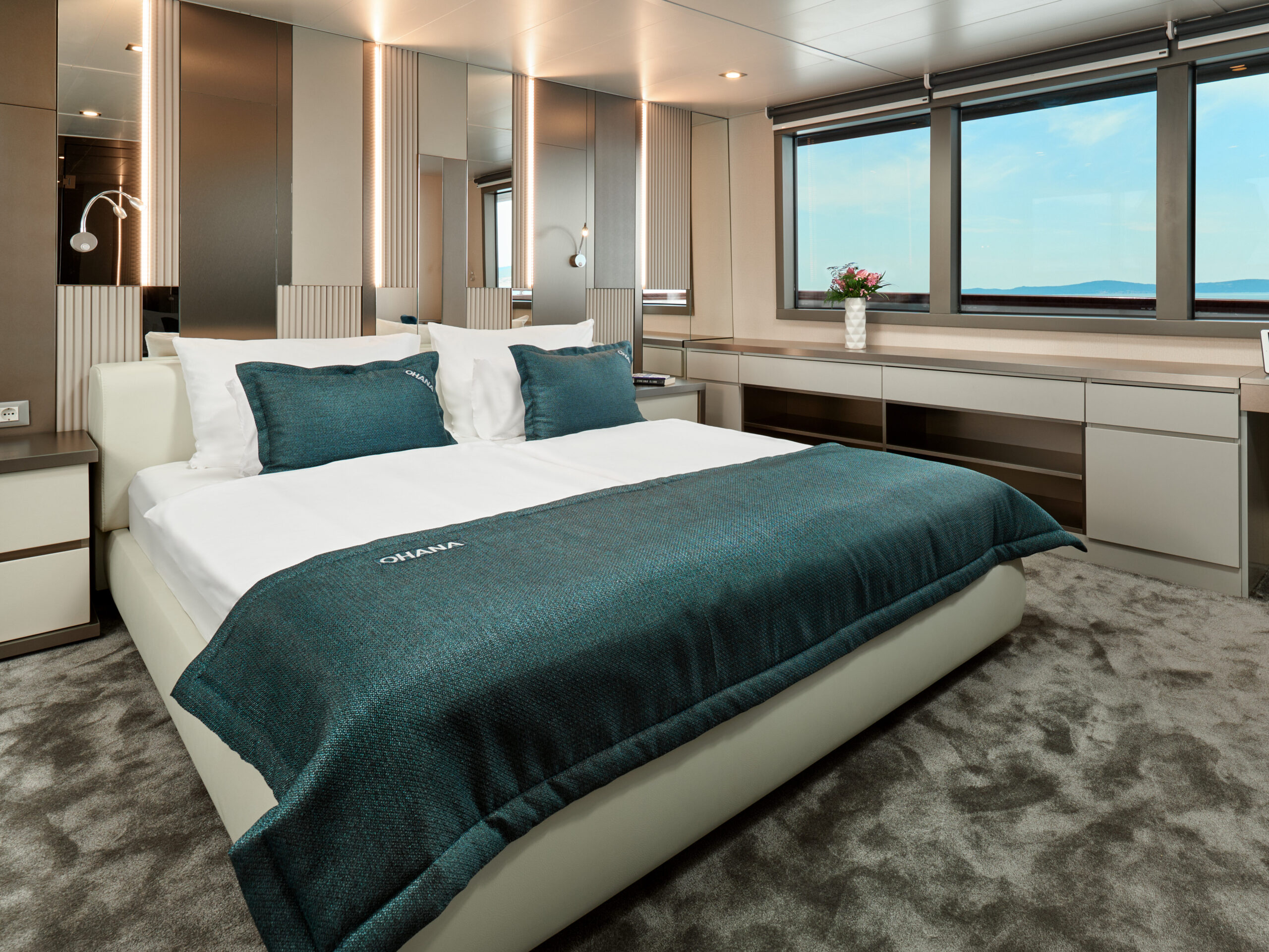 Experience ultimate dining and pampering on Yacht Ohana. The exceptional chef prepares culinary delights both indoors and outdoors. The salon features three exquisite marble tables where you can savor custom-tailored meals with breathtaking views from the windows. A comfortable sofa and large television create a