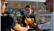 On the upper deck, enjoy al fresco dining near the special lounge area with an additional bar. Surrounded by smaller tables, immerse yourself in an intimate atmosphere, admiring the sunset, and savoring each delectable dish.